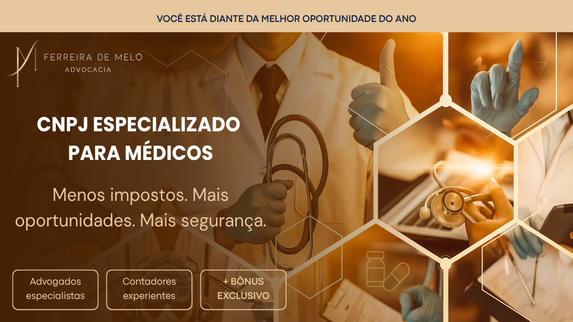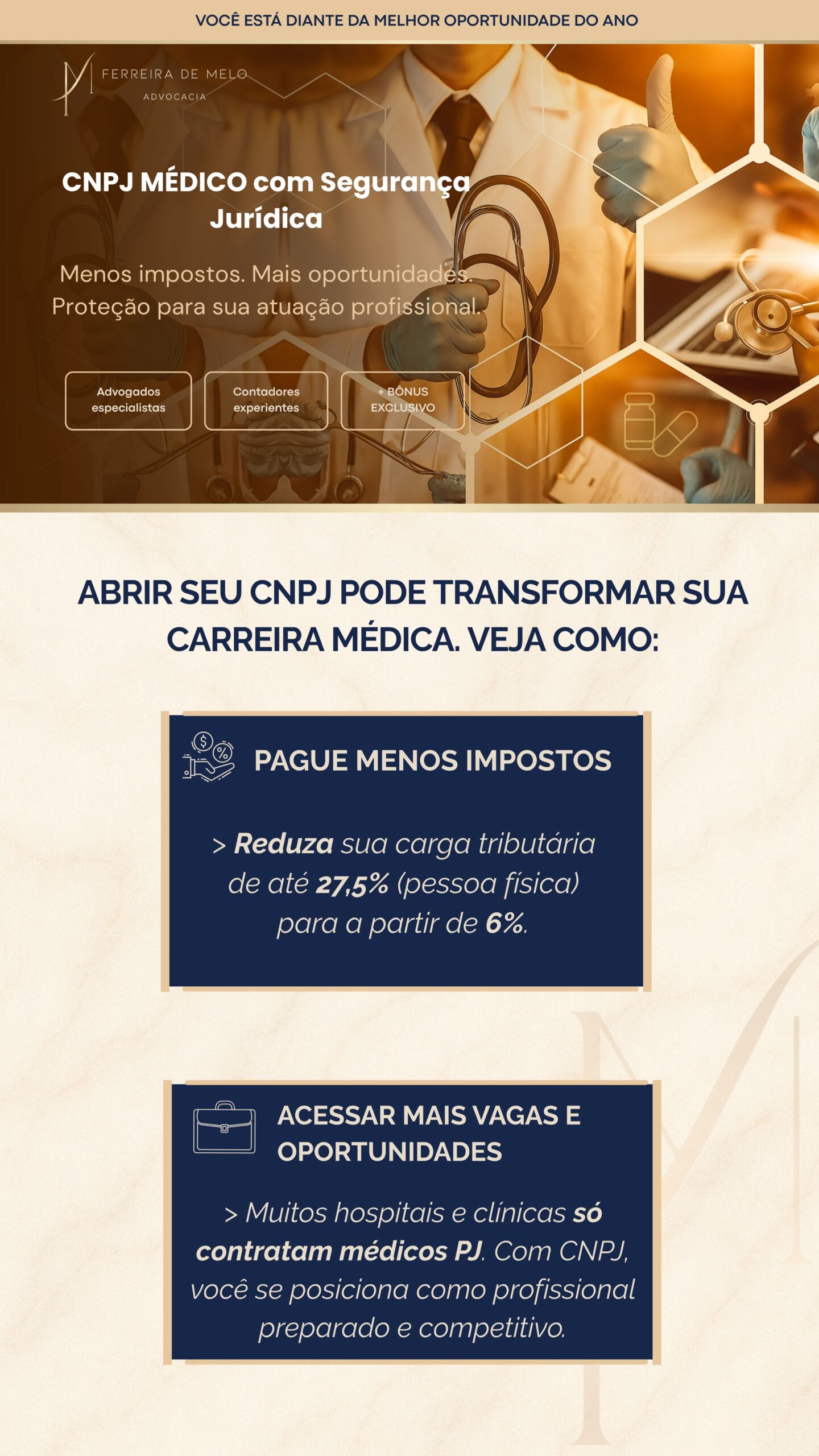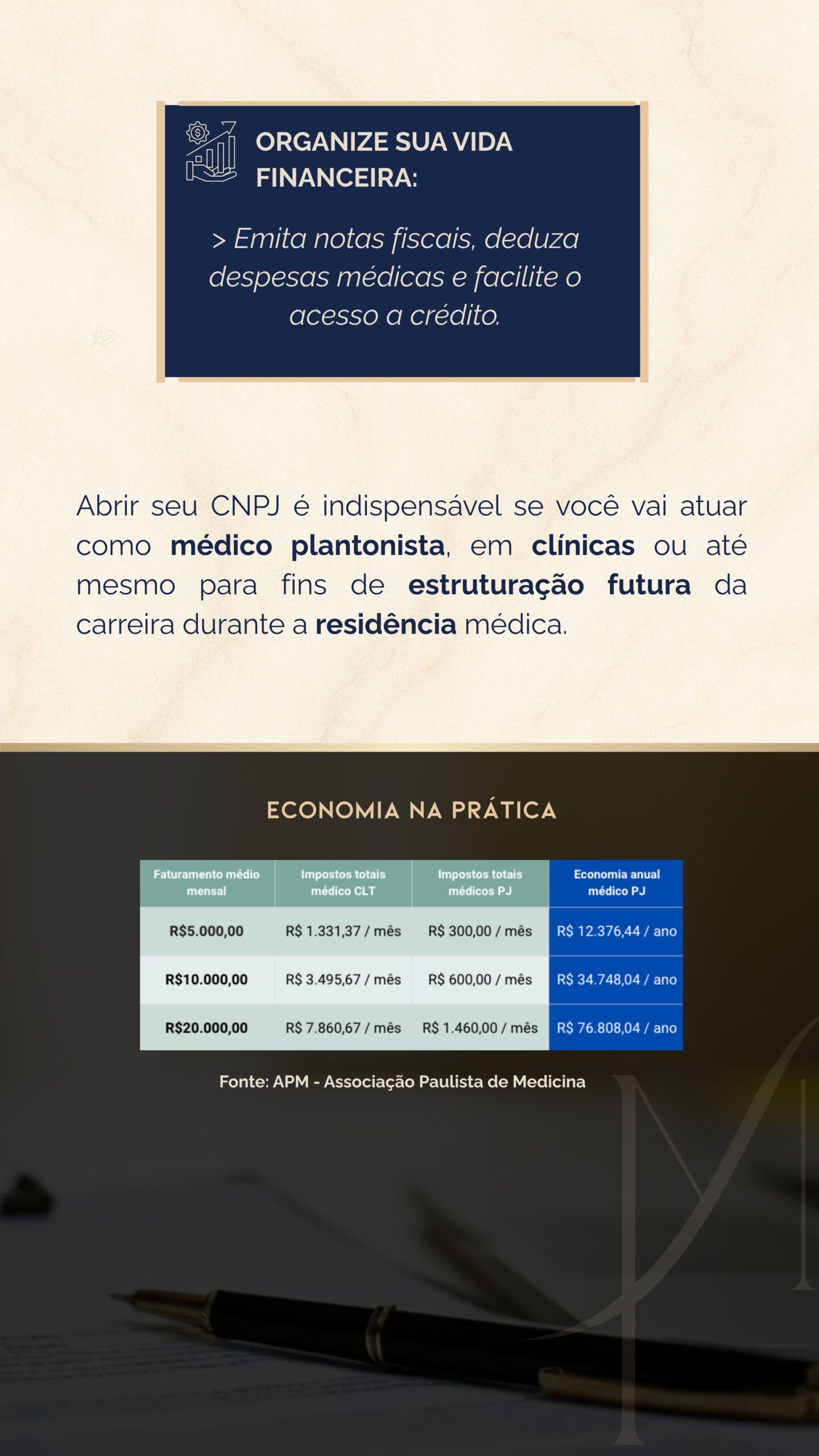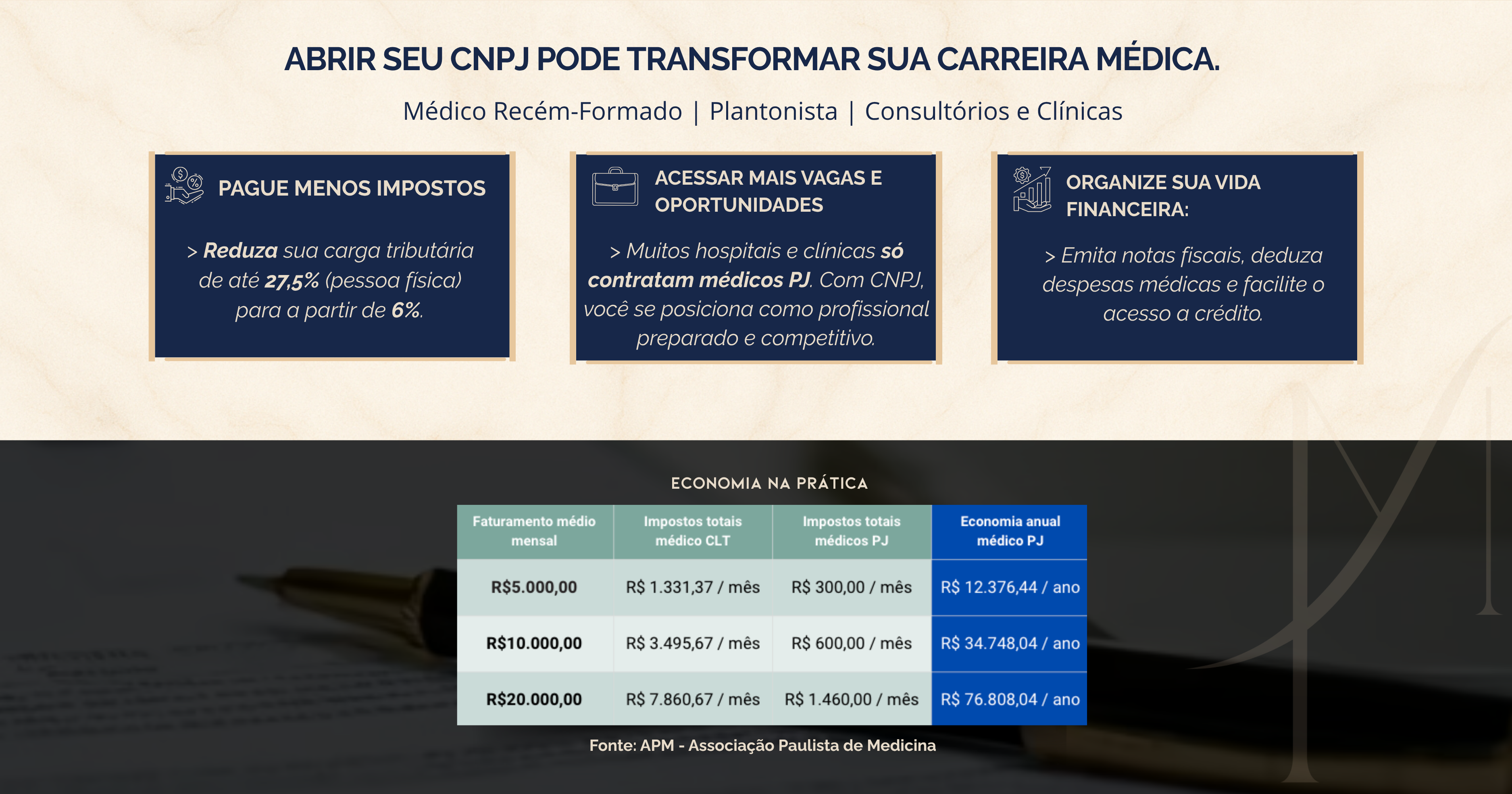O médico passa por uma entrevista jurídica personalizada, onde se mapeiam riscos éticos e tributários, conforme sua futura atuação (clínica, consultório, plantão, estética etc).